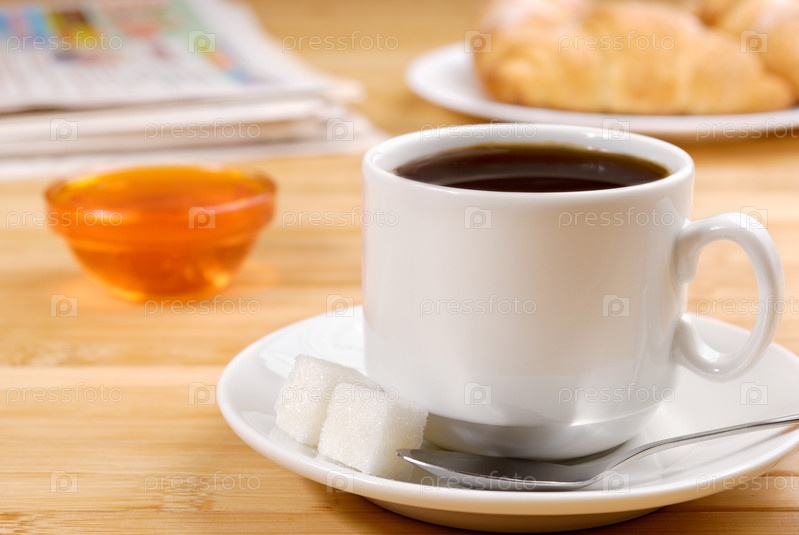Чашка черного кофе на деревянный стол с газетой в сторону
