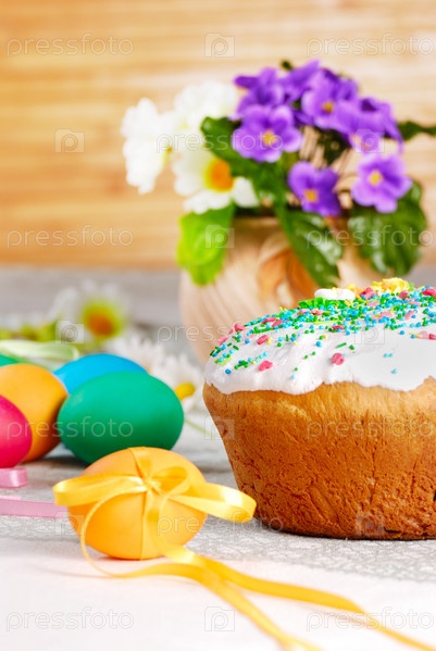Пасхальный хлеб и крашеные яйца на ярком фоне