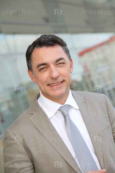 Бизнесмен стоя вне современное здание