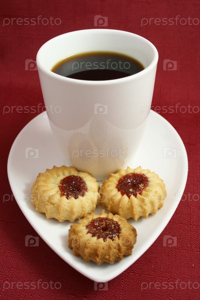 Чашка кофе и печенье с повидлом на столе