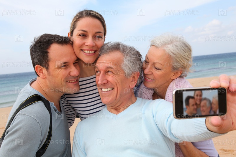 Семьи принимая фото на пляже