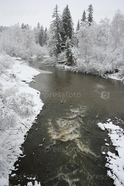 Замерзшая река и заснеженные деревья, зимний пейзаж