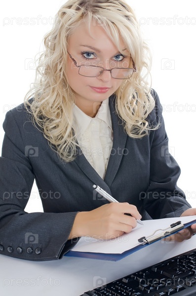 Деловая женщина за компьютерным столом пишет что-то на листе