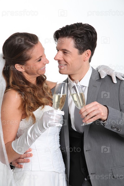 Невеста и жених, попивая шампанское