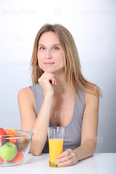 Красивая блондинка женщина, пить фруктовые соки