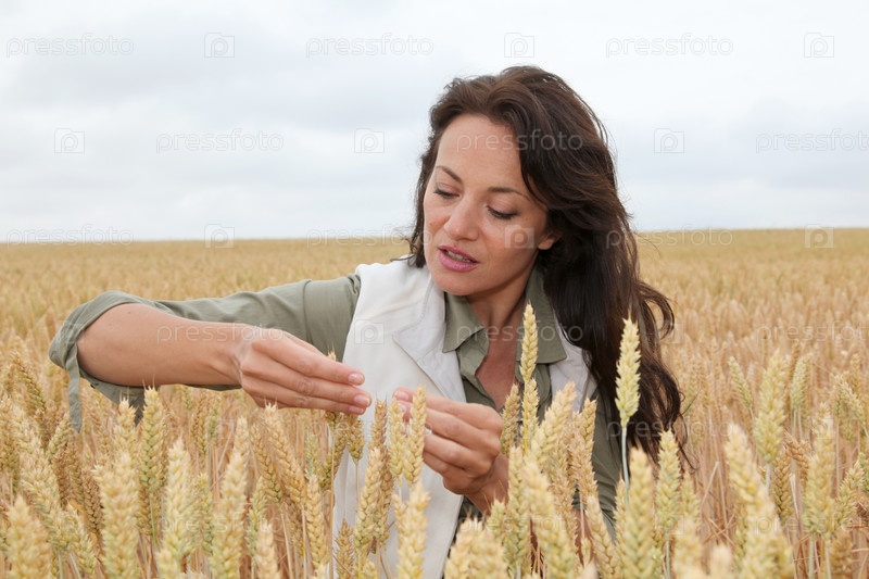 Женщина-агроном, глядя на колосья пшеницы