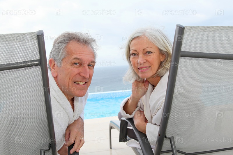 Пожилые супружеские пары, расслабиться в шезлонгах