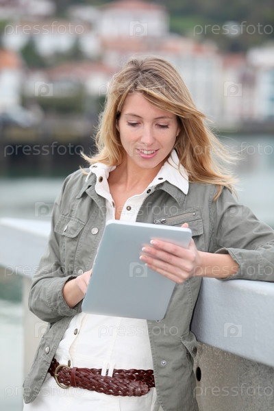 Красивая блондинка женщина, используя электронный планшет в городе