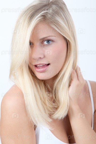 Красивая блондинка женщина на белом фоне