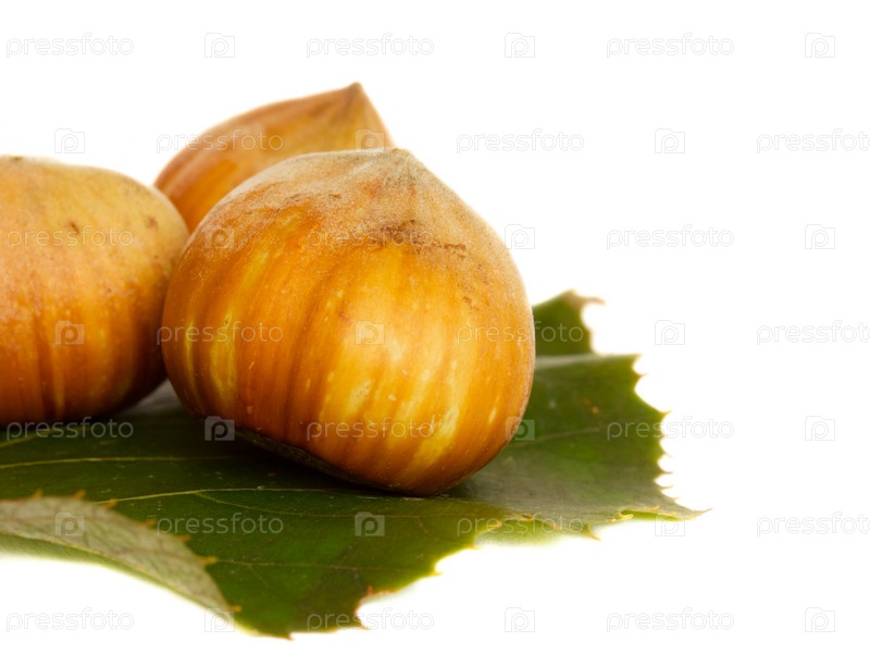 Лесные орехи на зеленым листике, белый фон