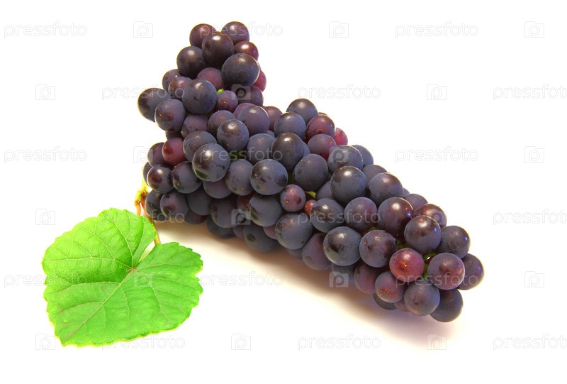 Черный виноград с зеленым листом на белом фоне