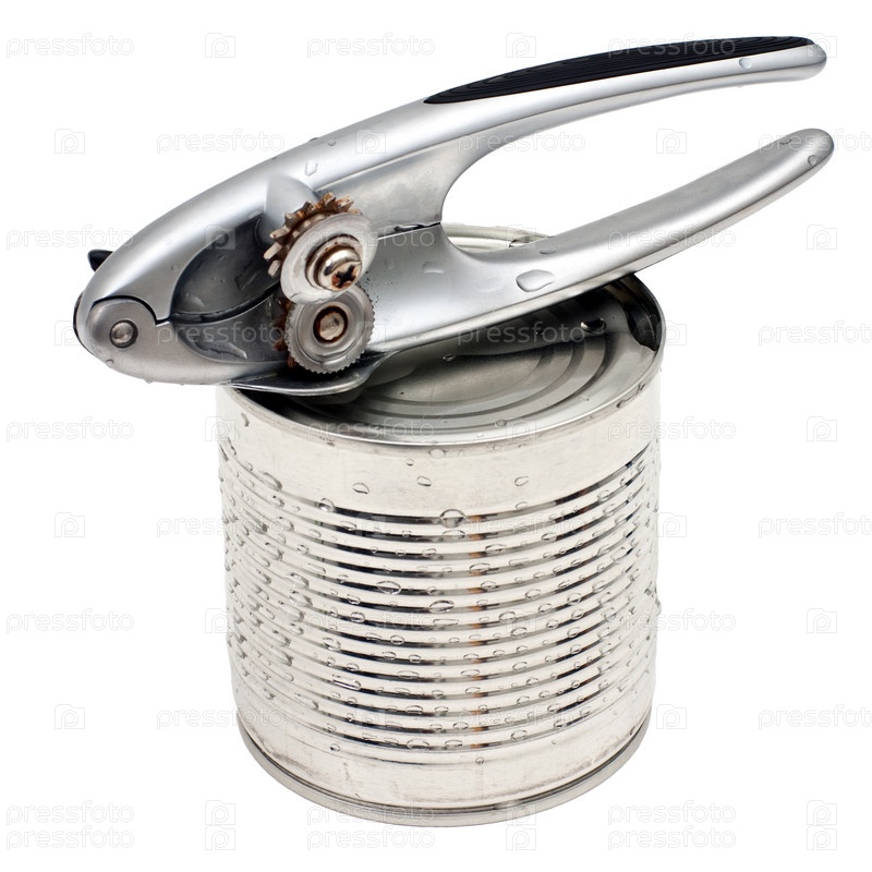Металлическая банка и открыватель для банок изолированы на белом фоне