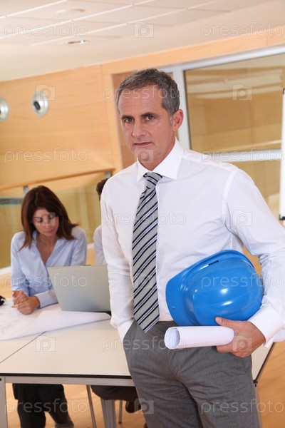 Архитектор стоял в офисе с планом строительства