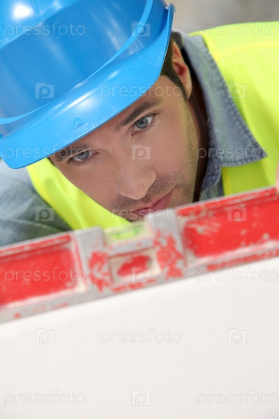 Работник, используя уровень на строительство сайта