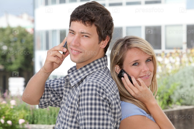 Молодая пара студентов с мобильного телефона