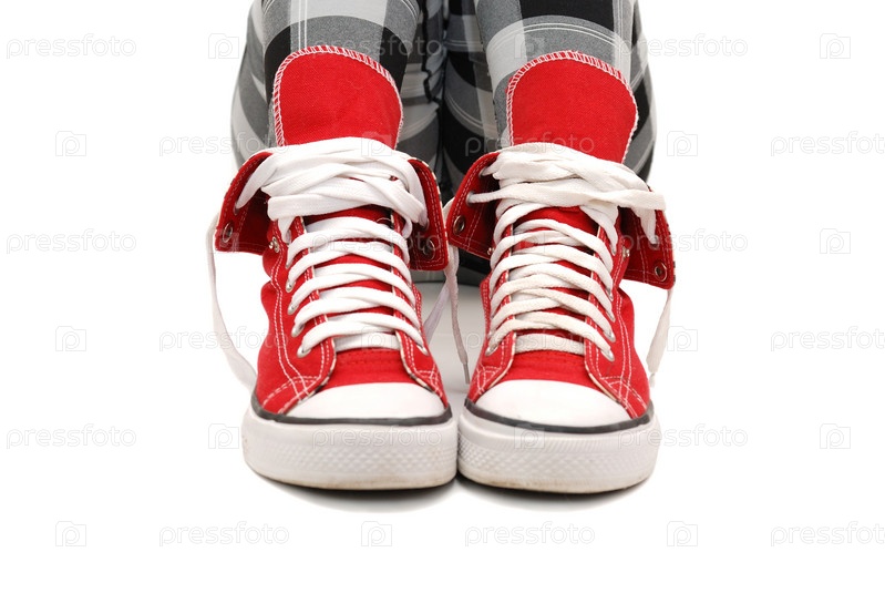 Красные кроссовки, клетчатые леггинсы. Изолированные на белом