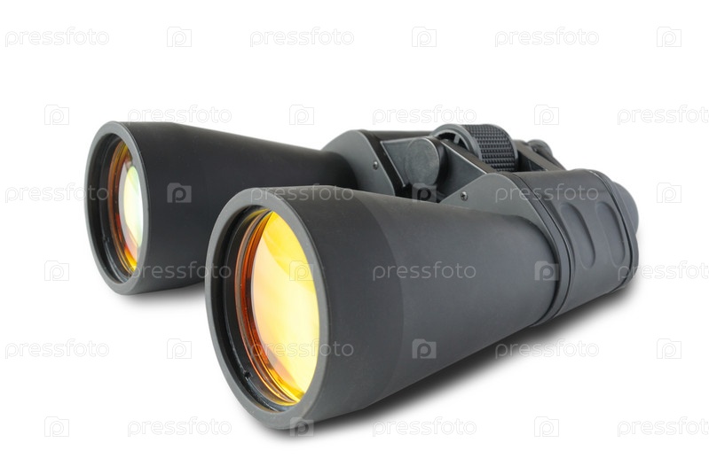 Черный бинокль на белом фоне. Желтая размышления на объектив