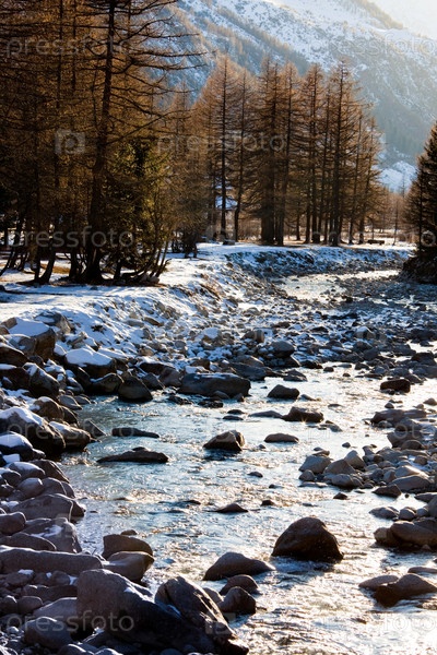 Спокойный горный поток проходит через заснеженные леса хвойных, зимний сезон, Запад Альпы, Италия, Европа