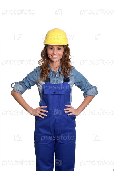 Женщина с желтым безопасности шлем стоя на белом фоне