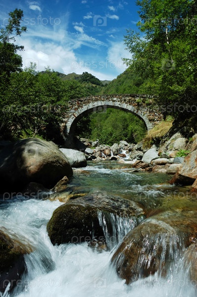 Возрасте арочный мост через реку небольшой горной