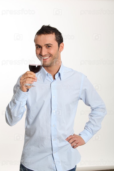 Молодой человек на белом фоне, дегустация красное вино