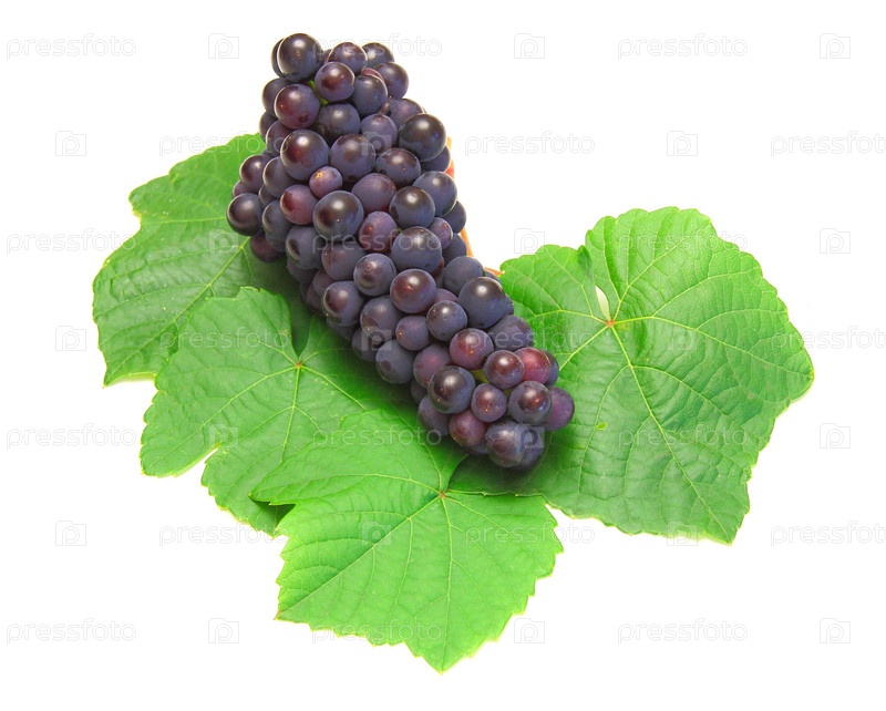 Гроздь черного винограда с зелеными листьями на белом фоне