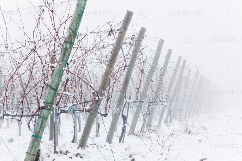 Заснеженные виноградники в тумане, зимний сезон, Италии, Европе