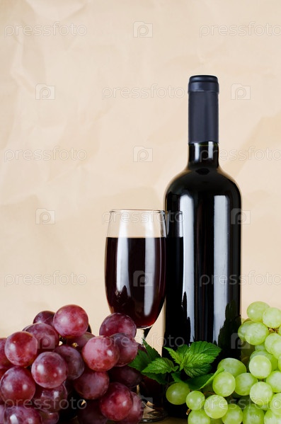 Красное вино и грозди винограда на фоне бумаги