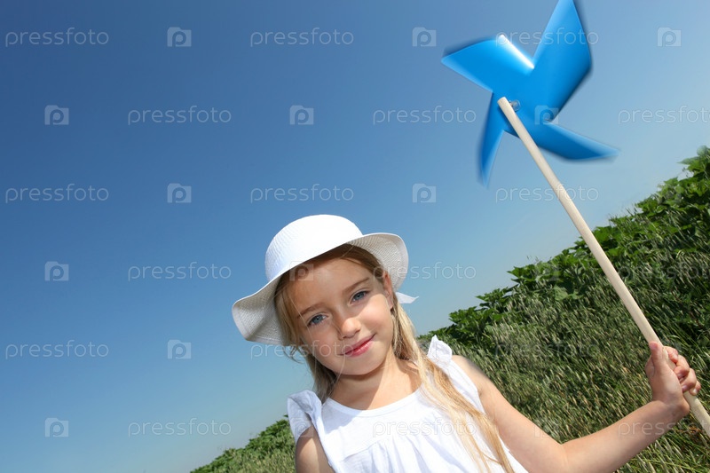 Маленькая девочка с колесом синий Ветер в сельской местности