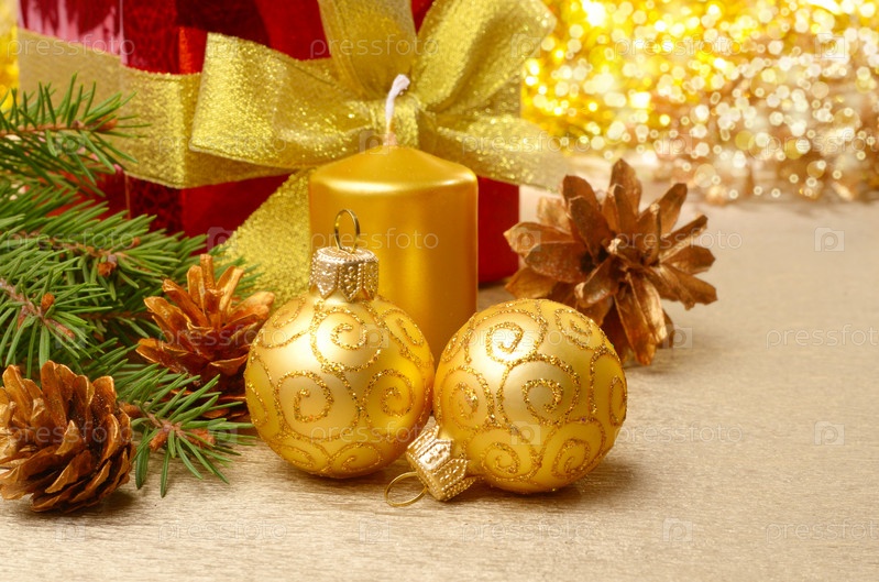 Рождественская елка украшения с подарочной коробке на золотом фоне