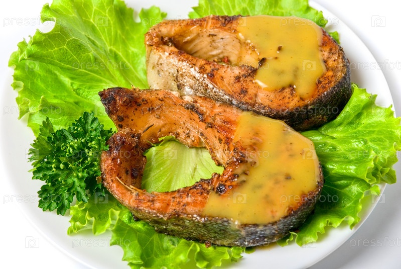 Жареная горбуша на листьях салата