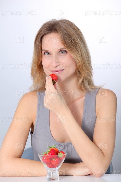 Красивая блондинка женщина ест клубнику