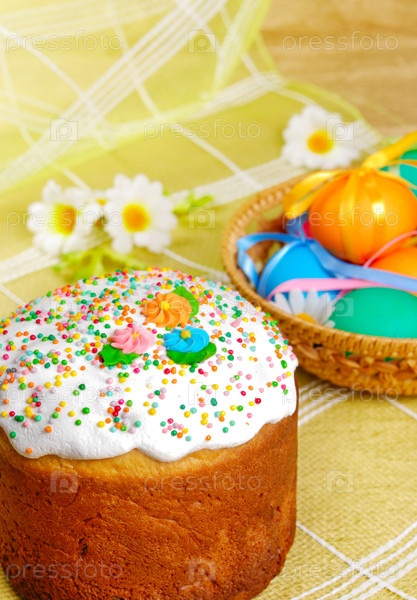 Пасхальные яйца и торт на ярком фоне
