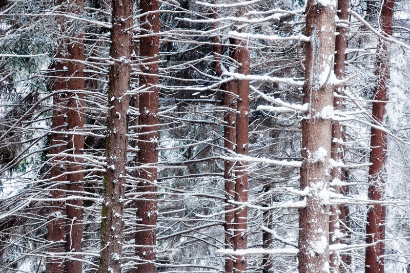 Сосновые стволы деревьев в зимний сезон