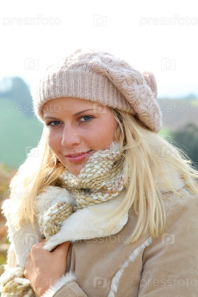 Блондинка женщина, одетая шерстяная шапочка в осень