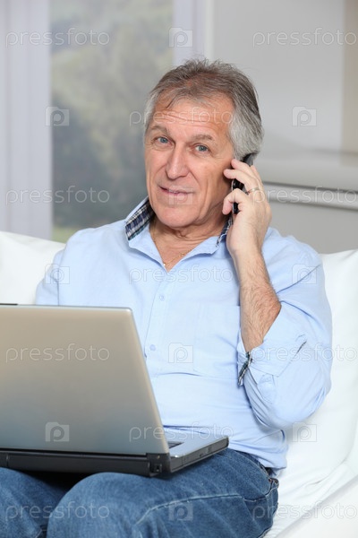 Старший мужчина в диване с ноутбуком и мобильным телефоном
