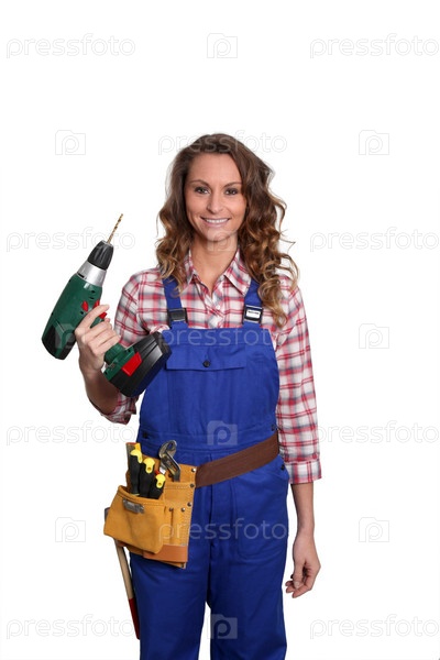 Женщина плотник стоя на белом фоне