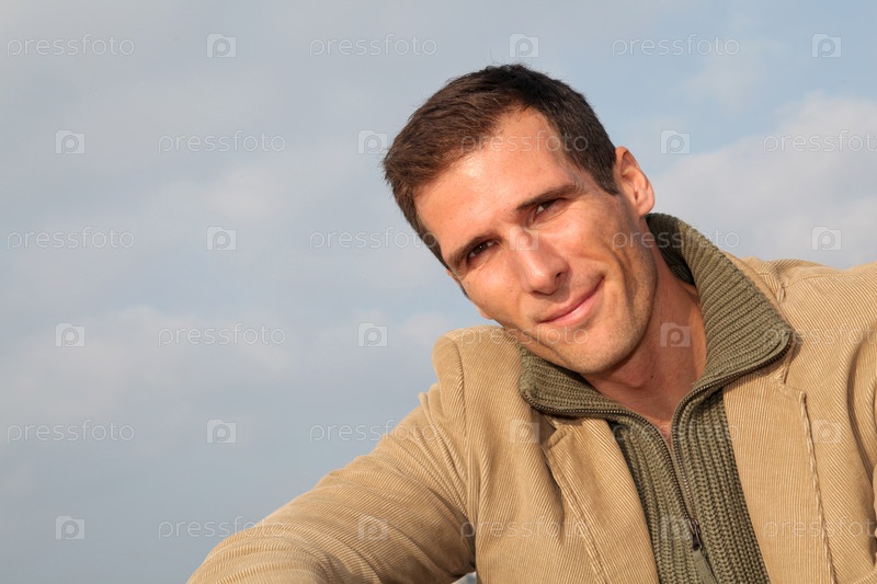 Улыбающийся человек, сидящий на пляже в осень