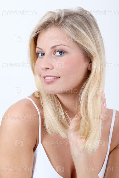 Красивая блондинка женщина на белом фоне