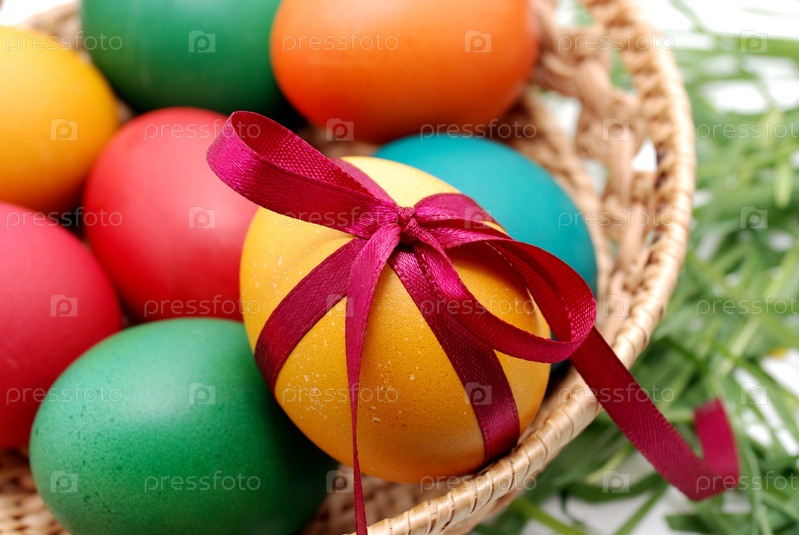 Различные цвета пасхальные яйца в корзину