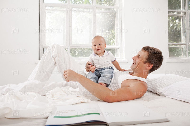 Молодой отец с сыном девять месяцев на кровати у себя дома