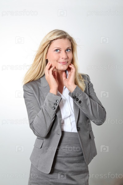 Блондинка предприниматель делает выражения на белом фоне