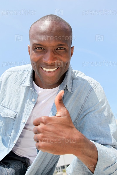 Человек, показывает палец вверх с голубым небом