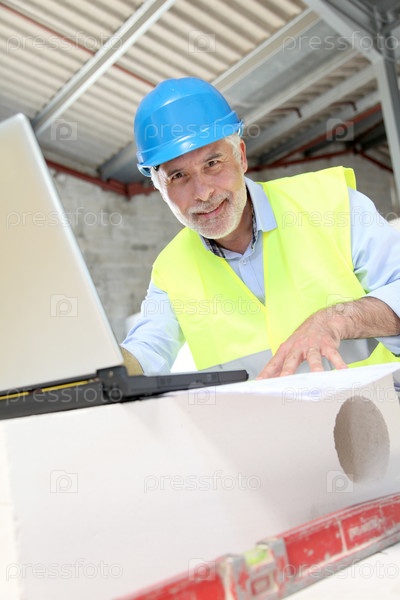 Архитектор, используя портативный компьютер на строительной площадке