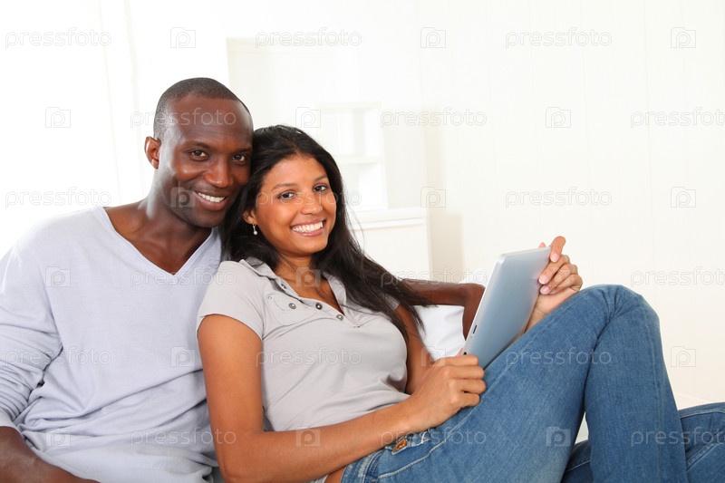 Счастливые влюбленные, сидя в диван с Электронные таблетки