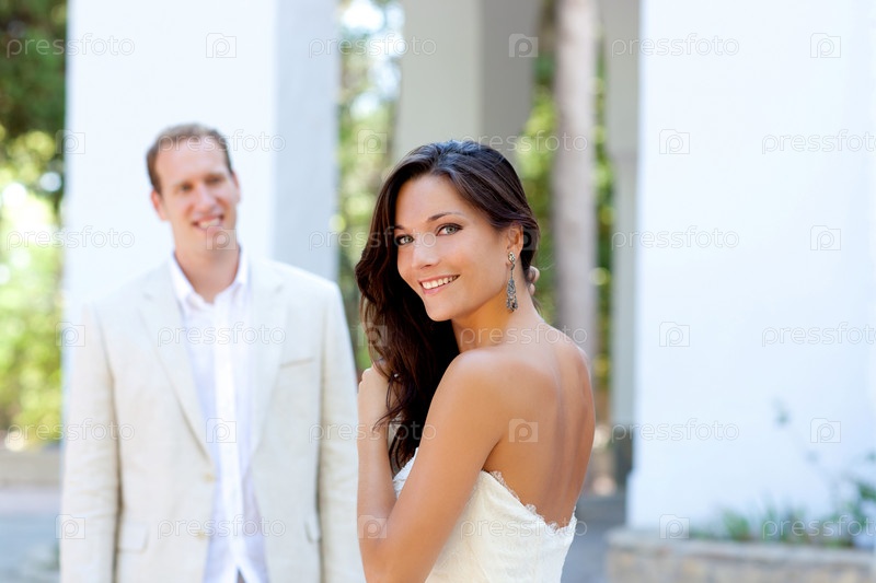 Портрет счастливой красивая женщина с мужчиной в размытия фона