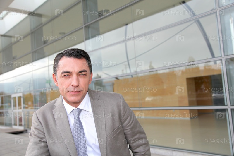 Бизнесмен стоя вне современное здание