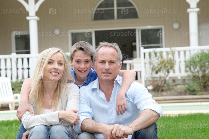 Портрет семьи, сидя перед их дом