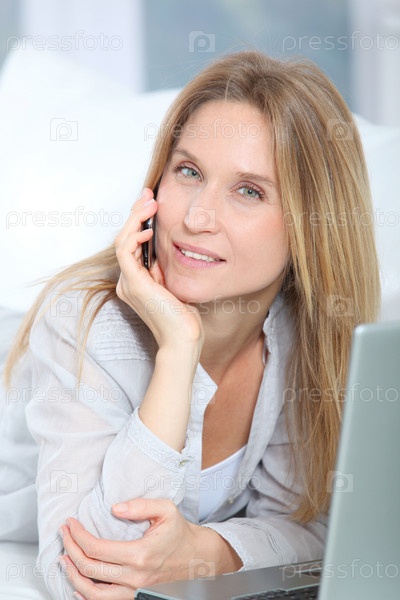 Красивая блондинка женщина, серфинг по Интернету на дому