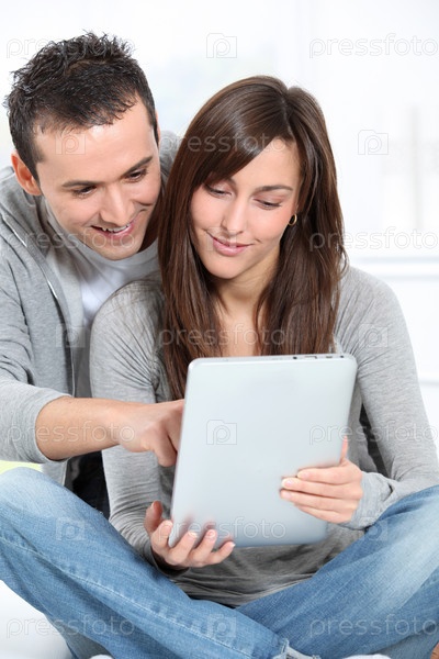 Молодая пара, сидя на диване с электронной площадки